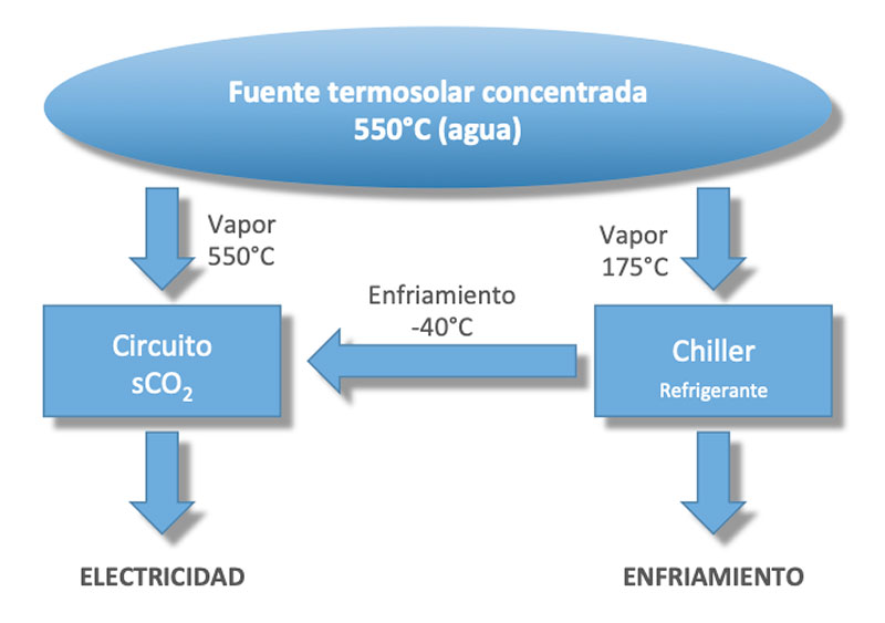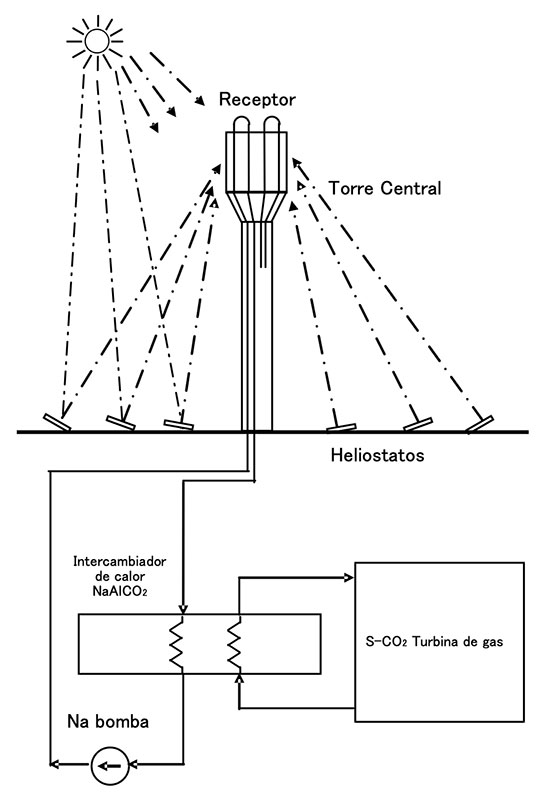 En plantas de potencia de torre central se pueden alcanzar temperaturas tan altas en el rango de los 640ºC. Estas temperaturas favorecen la eficiencia térmica de un ciclo Brayton de CO2 supercrítico. El uso de sales fundidas, tanto para enfriar el receptor como para transferir el calor al CO2 se ven atractivos.