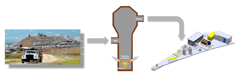 La gasificación de RSU consiste en la generación de gas de síntesis mediante temperaturas muy elevadas que descomponen las cadenas de carbono a los componentes fundamentales mediante varios métodos, ya sea por pirólisis o por plasma. El gas de síntesis es el combustible que se produce para, generalmente, ser quemado en una turbina de gas o motor de combustión interna para producción eléctrica. También es utilizado en otros procesos de síntesis para la producción de otros productos de valor agregado.