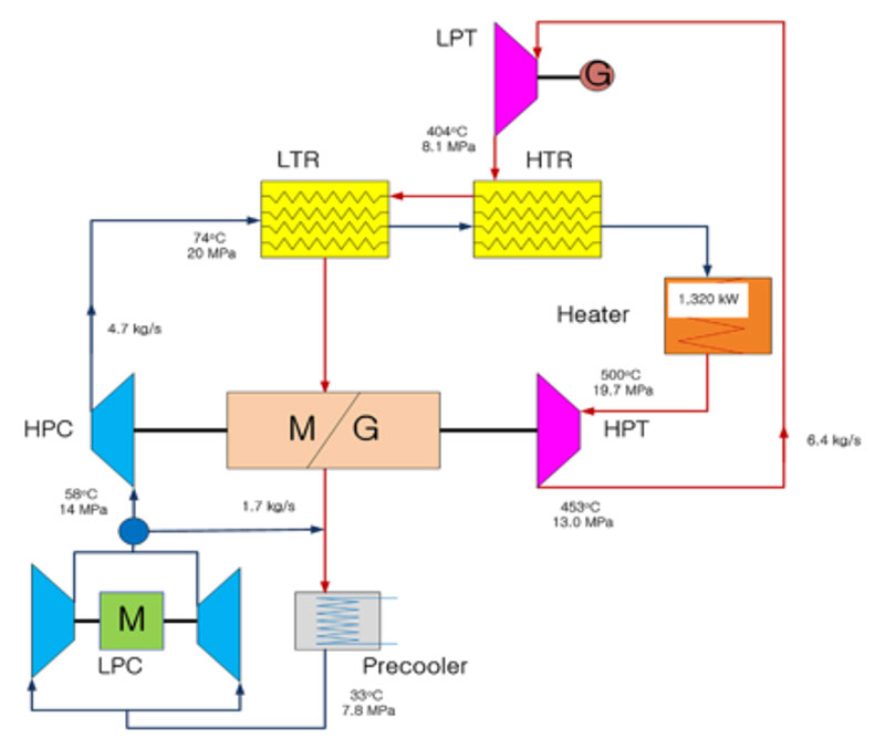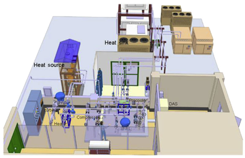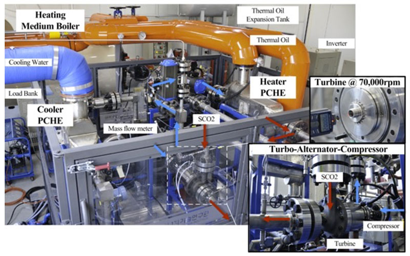 En el Japanese Institute of Applied Energy15 construyeron y están operando un circuito de prueba a escala de kW enfocado inicialmente al desarrollo de compresores. La instalación está diseñada para proporcionar las condiciones requeridas en el diseño de turbomaquinaria a escala reducida (compresores y turbinas centrífugas) y comparando con turbomaquinaria de una planta convencional de vapor.