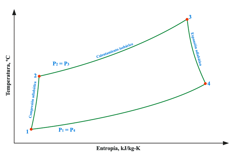El ciclo Brayton es aplicado básicamente al aire, considerado termodinámicamente compresible. El ciclo Brayton se compone de varios procesos: compresión adiabática, calentamiento isobárico y expansión adiabática.