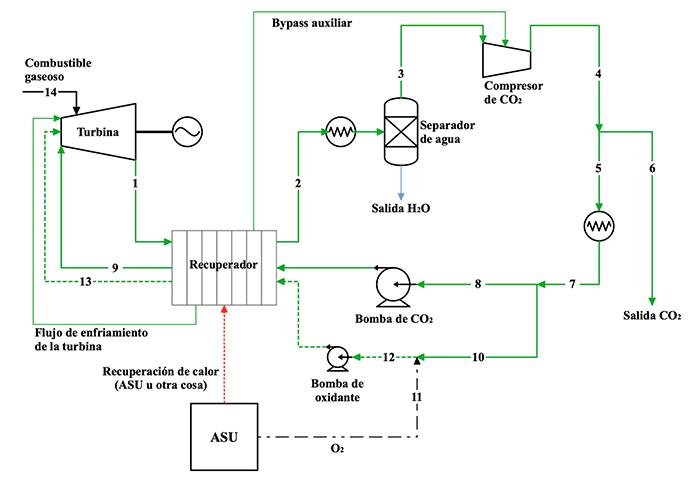 Esquema del proceso de un ciclo Allam a gas natural comercial simplificado (Fuente: Allam et al 2017).